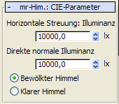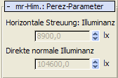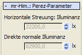 Jetzt werden auf dem Rollout "mr-Himmel: Perez-Parameter" in den Feldern "Horizontale Streuung" und "Direkte normale Illuminanz" die Beleuchtung aus Streuung und die direkte Beleuchtung angezeigt, die von der Wetterdatendatei auf das Perez-Modell angewendet wurde.