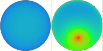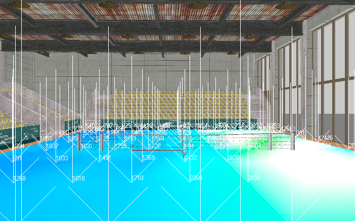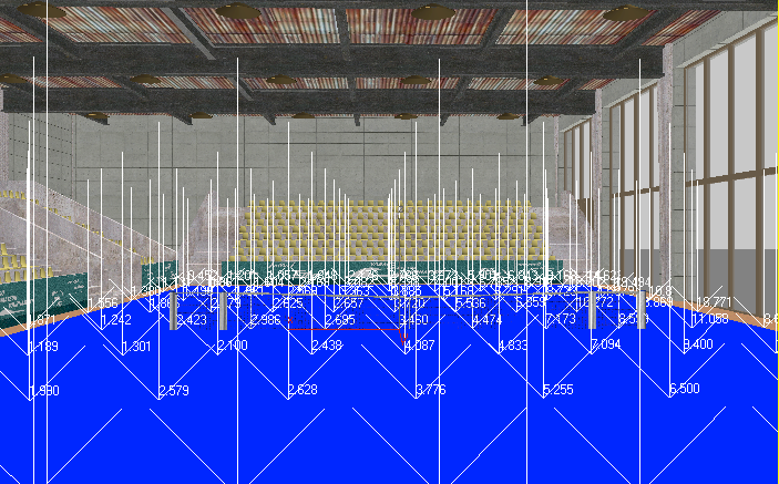 Das Innere des Tennisplatzes wird nach links hin in einem kalten Blau angezeigt. Dabei befinden sich selbst die niedrigsten Werte in einem akzeptablen Illuminationsbereich über 250 Lux. Zur rechten Seite hin in der Nähe der Fenster ändert sich die Farbe bis zu einem reinen Weiß. Weiße Bereiche bedeuten, dass sich die Illuminationswerte außerhalb des Bereichs der Farbcodierung befinden. Sie müssen die Farbcodierung nun anpassen, um einen gleichmäßigeren Verlauf zu erhalten, so dass Sie die Bereiche mit hoher Illumination besser auswerten können.