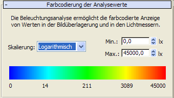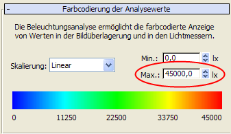 Da die Illumination der Szene an einigen Stellen über 42.000 Lux beträgt, ist der Farbbereich gegenwärtig zu schmal eingestellt. Sie müssen den Bereich der Farbskala verbreitern.