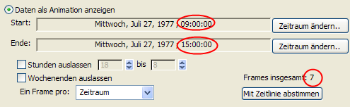 In der Gruppe "Wetterdaten verwenden" wird angegeben, dass insgesamt sieben Frames als Ergebnis des Auswahlbereichs erstellt wurden.