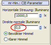 Über das Steuerelement "Direkte normale Illuminanz", das sich unterhalb von "Horizontale Streuung" befindet, können Sie die Sonnenstärke festlegen, so als würde man den Lichtmesser direkt in die Sonne halten.