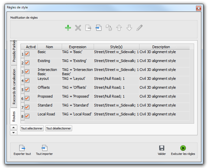 Vous pouvez créer des jeux de règles de style personnalisées pour d'autres utilisateurs. Après la définition d'un jeu de règles, utilisez l'option Exporter tout pour les stocker dans le dossier de ressources du modèle. Les autres utilisateurs pourront ensuite les charger à l'aide de l'option Importer tout. Reportez-vous à la rubrique Pour importer des règles de style pour l'affichage des données de projet 3D.