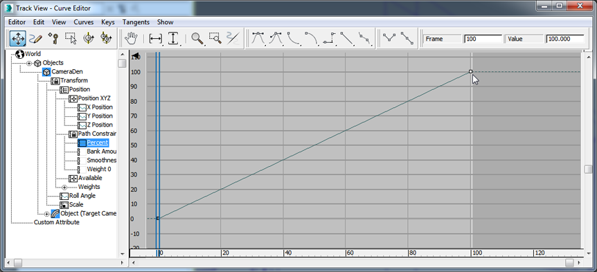 Die Funktionskurve bildet eine Ort-Zeit-Beziehung für die Position von CameraDen ab. Sie startet bei Frame 0, 0 Prozent des Pfads, und endet bei Frame 100, 100 Prozent des Pfads (wo der Spline ebenfalls endet). Um die Länge der Kamera-Animation zu ändern, müssen Sie den Zeitwert des letzten Keyframes bearbeiten.