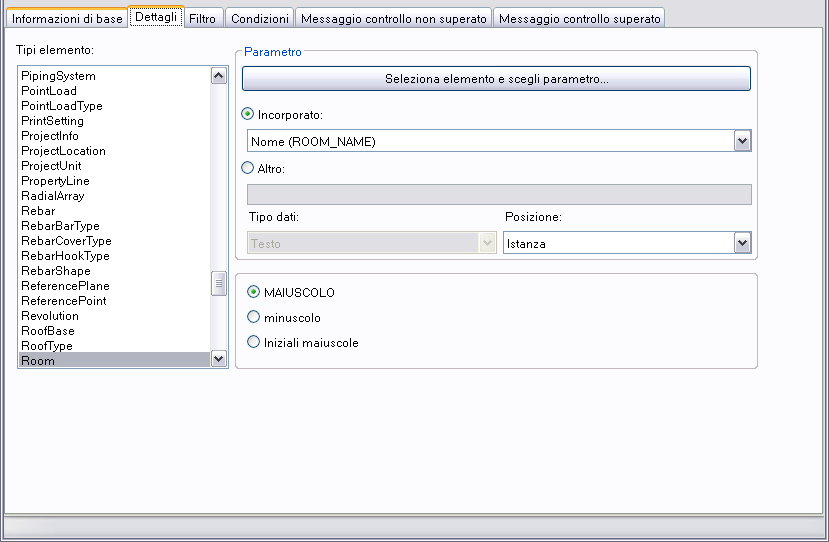 Il controllo Parametro elemento - Maiusc./minusc. verifica l'utilizzo delle maiuscole/minuscole nei parametri degli elementi selezionati.