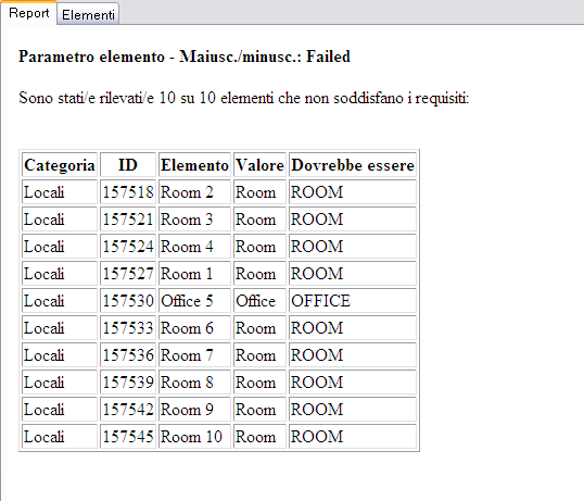 | Scheda informazioni: | Visualizza gli elementi che non hanno superato il controllo. Selezionare l'elemento per visualizzarne i dettagli. |