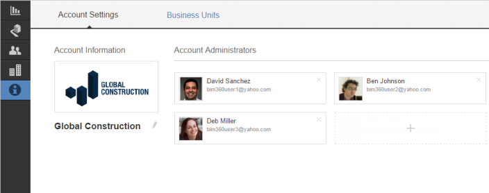 BIM 360 account admins manage account level information across projects and BIM 360 products. They can view directories of projects, partner companies, and users across projects and products. They can also manage their company logo and company name, and create and maintain their company business units