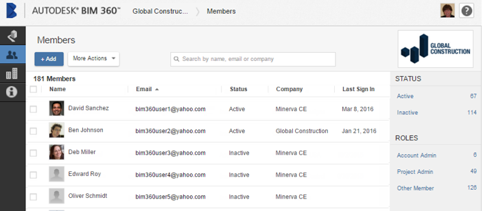 When inviting a project member, the project admin starts typing and a "lookup" service easily finds the user name and email from the master BIM 360 member directory. If a Glue project admin invites a member who is not in the BIM 360 member directory, that user will be added to the member directory in Account Administration. Glue project admins can also deactivate members from their project and change access levels at any time.