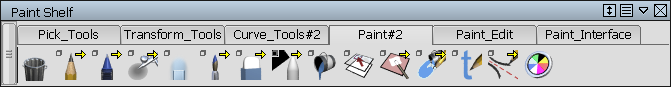 默认的绘画工具架包含绘画工作流所能用到的所有工具。该工具架和标记菜单非常适用于在全屏模式下使用。您可以通过“Layouts”