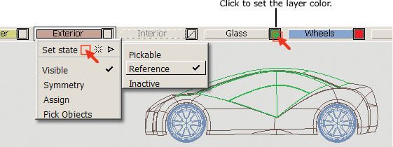每个“Layer”(层)选项卡都包含一个子菜单,用于指定对象和切换层可见性。“Set State”子菜单可以将几何体放入背景,可见但不可拾取:
