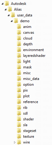 user_data 文件夹中包含 Alias 所需的项目文件夹。默认情况下,Alias 会创建一个“Demo”项目供您使用。一个项目中包含多个文件夹,其中最重要的是“wire”文件夹(在该文件夹中保存实际文件)和“pix”文件夹(图像的默认保存位置)。