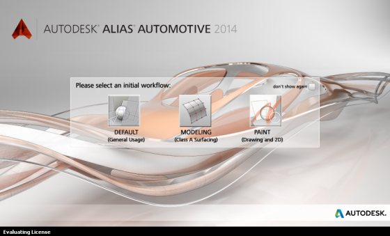 如果您运行的 Alias 产品同时包含建模和绘画功能,则会打开如上图所示的窗口。选择“Default”将在适合建模和草图绘制的环境中打开 Alias。选择“Modeling”将在适合 A 级曲面的环境中打开 Alias。选择“Paint”将在为二维草图绘制开发的环境中打开 Alias。