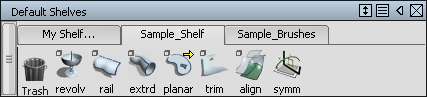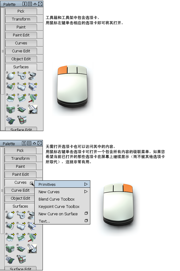 此符号也表示存在一个子菜单,但是它用于工具箱和工具架中的工具图标。单击并按住带有此符号的图标可打开子菜单。