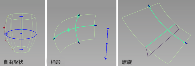 “Revolve”工具也可以创建两个不同类型的旋转曲面,非常适用于构建车辆侧窗。“Barrel”曲面取五个点作为输入。“Helix”曲面取一条曲线和两个点作为输入,并额外提供了一个用于创建螺旋形状的选项。
