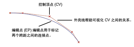 Alias 按不同方式绘制 CV,使您可以区分曲线的起点和终点。第一个 CV(位于曲线的起点)绘制成一个方框。第二个 CV 绘制成一个小的“U”,以显示从起点开始递增的 U 维。其他所有 CV 都绘制为很小的 X。最前面的两个 CV 和最后面的两个 CV 分别定义曲线起点和终点的切线方向。