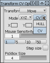若要快速而不精确地移动 CV,可以结合“Pick”“Point Types”“Hull”和“Pick”“Point Types”“CV”使用“Transform”工具箱中的工具。若要进行精细、准确的控制,则需要使用“Transform CV”提供的高级工具。