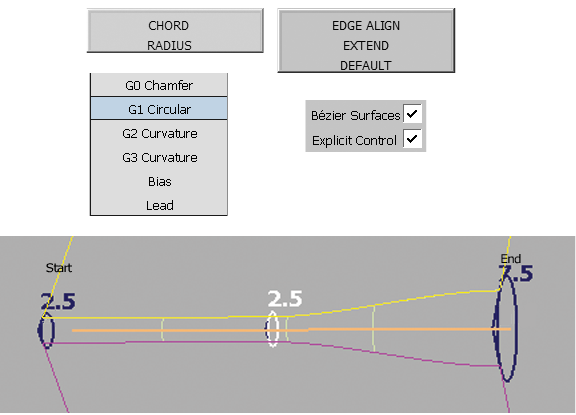 “Construction Type”、“Variable Fillets”和“Section Type”选项可提供所有类型的“Surface Fillet”轮廓。