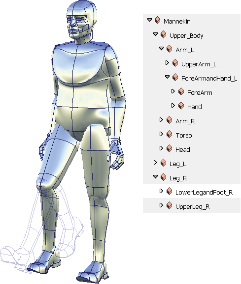 在该人体模型示例中,需要旋转每个肢体以确定模型姿势。例如,小腿上的曲面需要具有单个对象的行为,而且应该能够绕膝盖旋转。通过成组可以提供单个轴心点,使小腿上的所有曲面能够作为单个图元旋转。