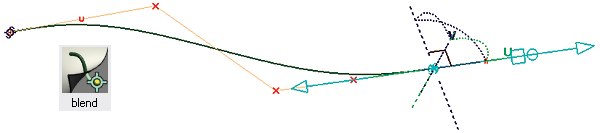 过渡曲线连接到曲面并自动使用 G2 连续性对齐。这些曲线为普通 NURBS 曲线,通常为单跨距 5 阶,但要使用过渡点而不是 CV 进行操纵。过渡曲线具有构建历史,而且在修改曲面时会保持与曲面的连接。