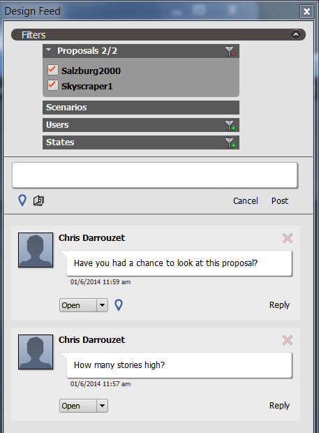 您可以使用“设计提要”讨论联机模型、方案和场景。您可以添加注释仅供自己查看,也可以与他人共享您的注释。使用 InfraWorks 360 移动应用程序的用户或查看者可以回复注释和添加自己的注释。
