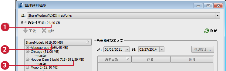 面板右侧显示“模型历史记录”。“历史记录”中包括更新的日期和时间,所上载更改的作者,以及所上载更改的描述的开头部分(如果有)。如果描述过长,单击“详细信息”可在更大的窗口中进行查看。