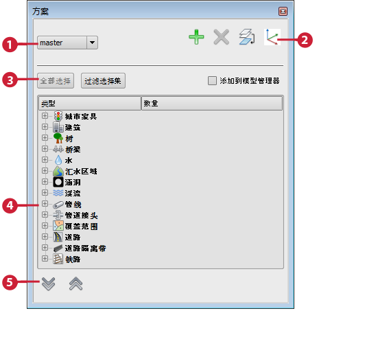 若要选择通过绘制或导入而添加到当前方案的所有要素,请单击“全部选择”。如果当前选择集包含方案要素以及主控要素,单击“过滤选择集”可仅显示该选择集中添加到当前方案的成员。 |
