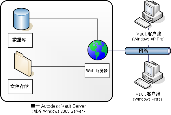 共享环境中的 Autodesk Vault Basic 由两个组件组成:Vault 服务器和 Vault 客户端。服务器用于存储所有设计信息的主要数据文件。客户端用于访问存储在服务器上的文件。