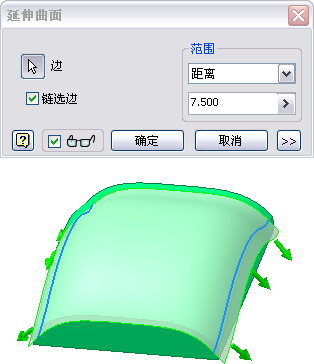 - 选择偏移曲面的两条外侧边作为“边”选择项。指定偏移值 7.5 mm。单击“确定”完成该命令。