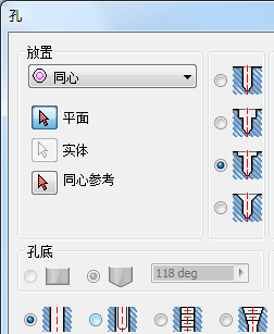 - 在“孔”对话框中,将“放置”设定为“同心”,将“孔类型”设定为“沉头孔”。