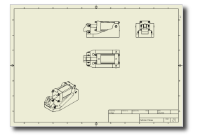 将打开一个单图纸工程图,其中包含“零件 2”和“部件”教程中使用的圆柱体夹具部件的三个平行视图和一个等轴测视图。