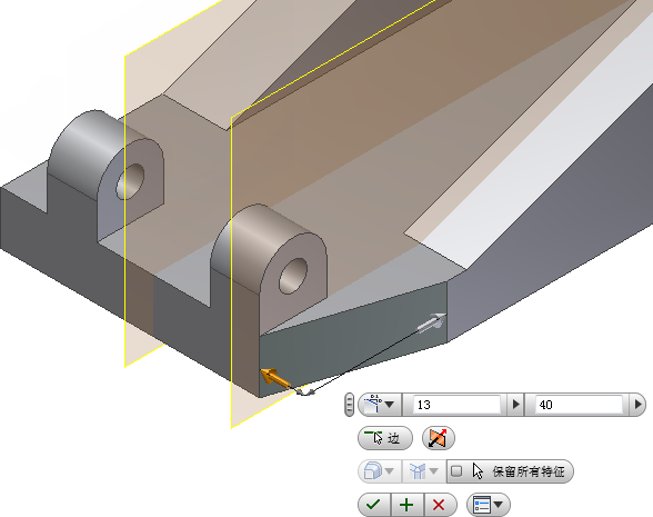 - 在小工具栏的左侧值输入框中输入值 13 mm 作为“倒角边长 1”,在右侧值输入框中输入值 40 mm 作为“倒角边长 2”。单击“边”按钮并选择零件外部的竖直边。如果预览图像看起来与下图中的预览不同,则调换距离输入或使用“反向”箭头调换参考面。