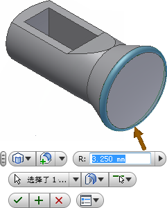 注: 虽然本练习中不会描述每个小工具栏组件,但建议您查看 Inventor 帮助中的“圆角”主题。