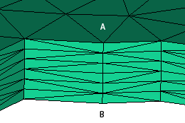 手动编辑可能会意外导致节点 A 及 A 与 B 间的全部内部节点合并到底面的节点 B 上。局部区域如下图 2 所示。节点 B 的厚度实际为零。如果发生这种情况,我们认为网格在节点 B 处折叠