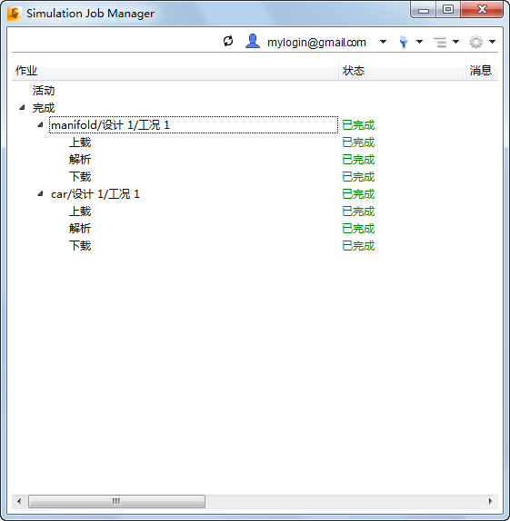 “作业”列表是作业的分层次列表。每个产品名称下基于时间的组按照作业的状态(活动作业、最近完成的作业、或已完成较长时间的作业)整理作业。每个作业都有几个子分支,以显示模拟进程各个阶段的状态和历史记录。