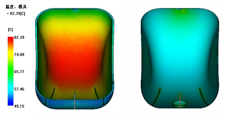 此结果表明了模具表面或塑料/金属界面处的周期平均模具温度。非结晶材料(如此处使用的 ABS)的最佳温度变化范围是与目标温度相差不超过 10°C。在本例中,目标温度为 70°C。所以,此零件的范围远远超出了 10°C 的范围。零件的大部分区域温度过低,尤其是在型腔侧。型芯侧的温度也远高于型腔侧。这种温度分布可能会造成零件翘曲。