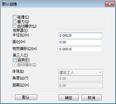 4. “默认碰撞”对话框中,选择希望 Autodesk Navisworks 在初始化时使用的默认选项。