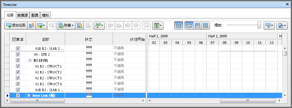 从数据源(例如 Microsoft Project™)导入时,Autodesk Navisworks “TimeLiner”支持分层任务结构(有关详细信息,请参见“数据源”选项卡)。分别单击任务左侧的加号或减号可以展开或收拢层次结构。