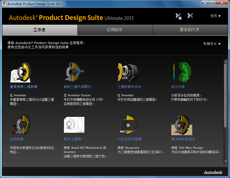“工作流”选项卡 显示 Product Design Suite 中的应用程序常用的工作流。