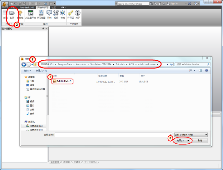 2. 单击“打开”,然后导航到 C:\ProgramData\Autodesk\Simulation CFD 2014\Tutorials\Exhibit Hall。