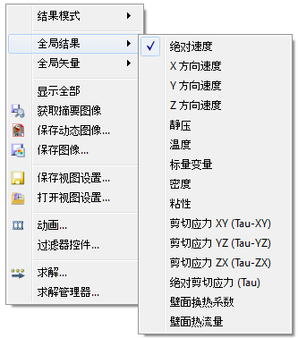 若要显示所有流体面(入口、出口和流体区域之间的内部面)上的矢量,右键单击,然后选择全局矢量。从展开的菜单列表中选择所需的数量。