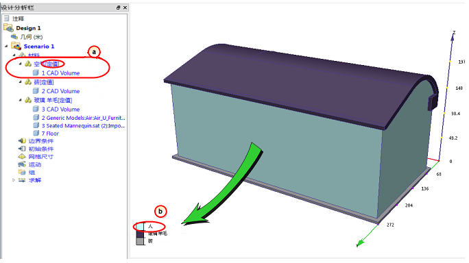 9. 若要验证空气材料是否已正确指定,请查看设计分析栏和部件颜色: