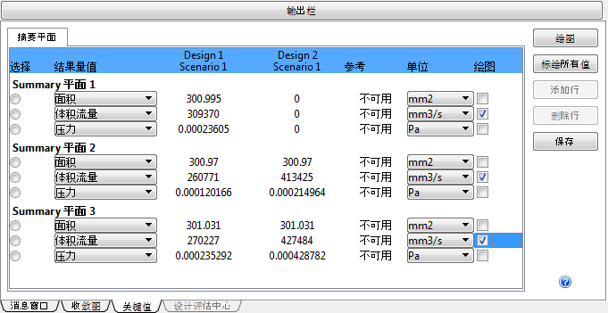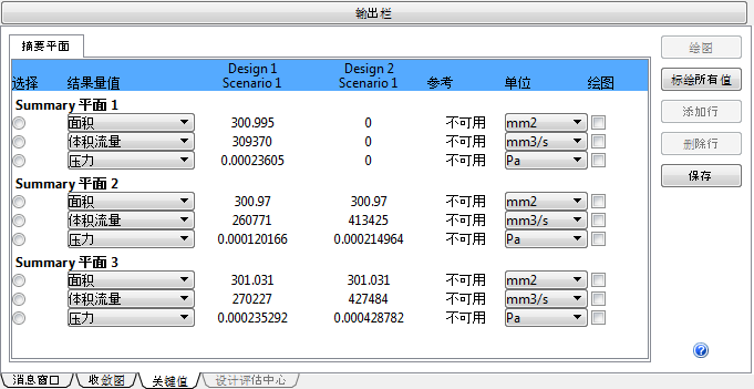 注: 在输出栏的“关键值”选项卡上,查看“摘要平面”数据。