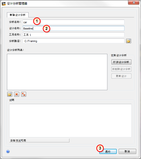 3. 在设计分析管理器中,为设计分析、设计和工况指定名称