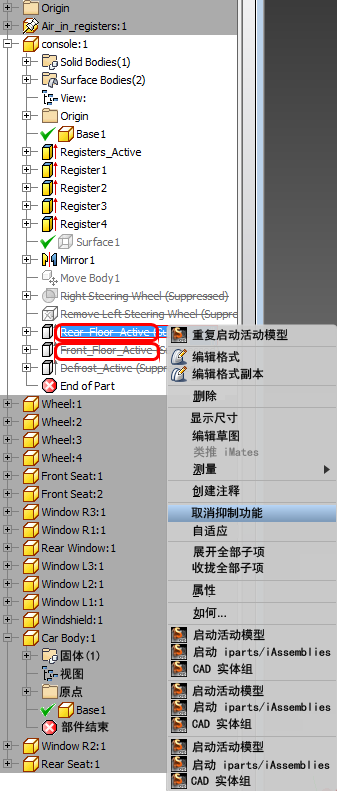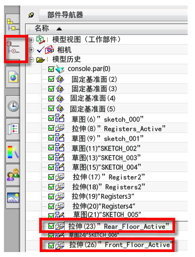 将控制台部件(或右控制台部件)设置为工作部件,并激活部件导航器。选中相应的框以启用每个特征。