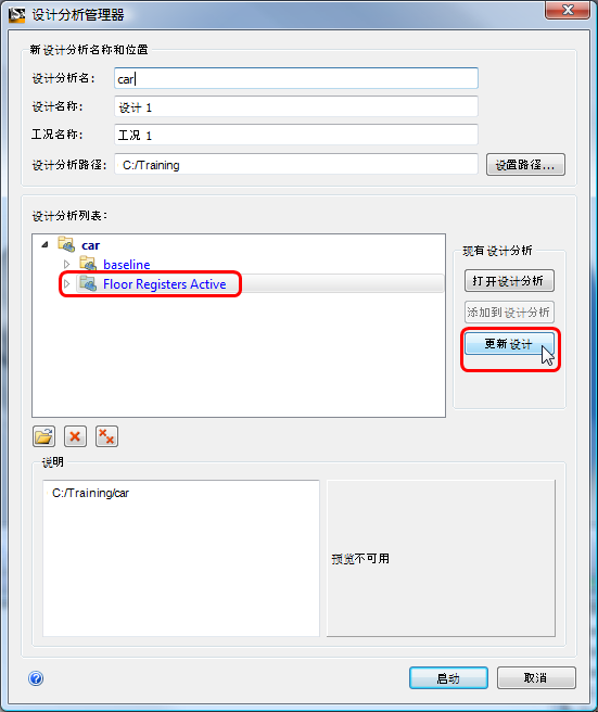 注: 原因何在?在“基准”配置中,Autodesk Simulation CFD 生成了三个不同的空气体(主座舱体、入口和控制台中的隔离体)。在我们添加后地板通风装置时,第三个隔离区域成为主座舱的一部分,无法指定原本指定给该部件的“空气”材料。因此,该部件被视为“丢失”,我们必须将其删除才能运行此设计。