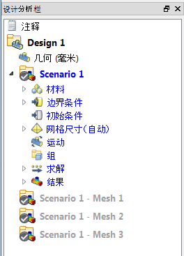 每个设计分析包含至少一个设计(具体的 CAD 几何体),每个设计包含至少一个工况(材料、边界条件和网格设置集合,以及相关的分析结果)。设计使用粗体黑色字符列出,工况显示为粗体蓝色字符。设置指定和结果使用细蓝色字符列出于每个工况中。从此窗口中管理分析。