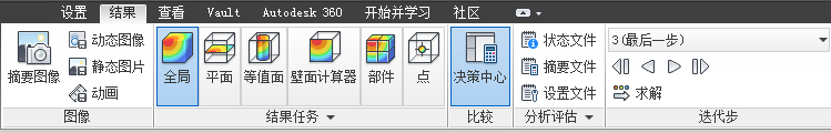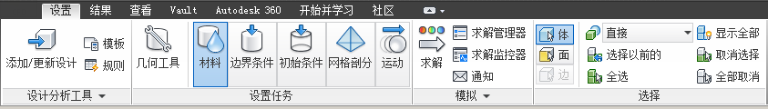 “设置”>“设置任务”和“结果”>“结果任务”中的控件可调用特定的任务模式,这些任务模式是 Autodesk Simulation CFD 流程中的基本步骤。一些与活动任务相关的常用控件显示在一个额外附加的上下文相关面板上,该面板位于功能区右侧。