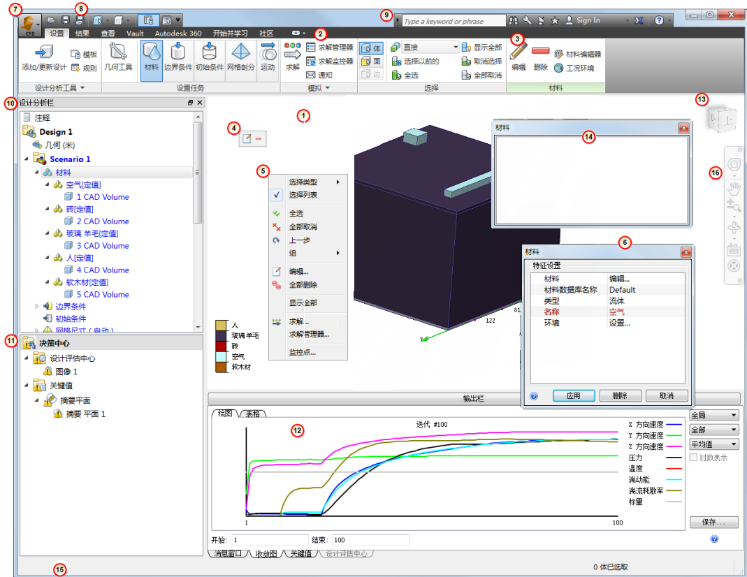 下面是 Autodesk Simulation CFD 用户界面的默认布局:
