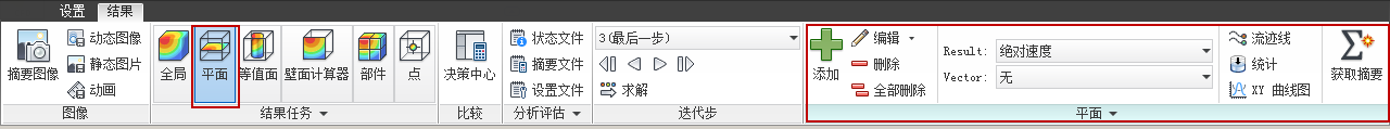 当“结果”选项卡上的“平面”任务处于活动状态时,“平面”上下文面板将显示为: