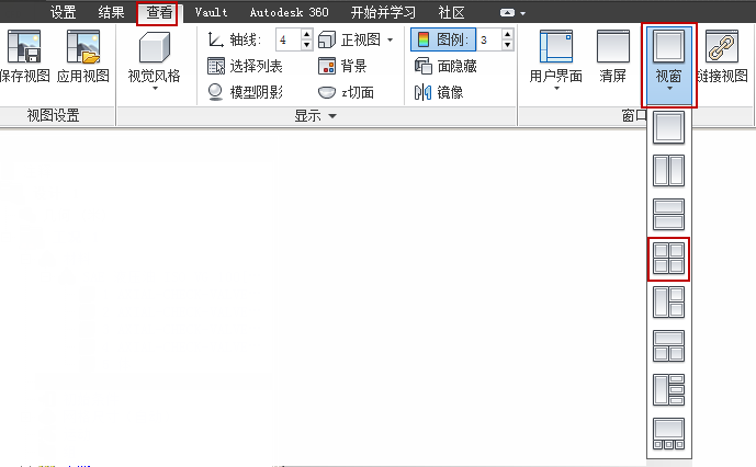 若要显示四个视口,请单击“视图”选项卡中的“视口”,然后选择四个视口: