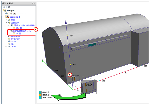 6. 若要验证边界条件是否已正确应用到返回管,请查看设计分析栏和返回面上的彩色条纹: